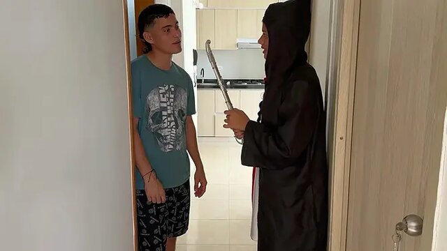 My step sister, a stunning Latina with a huge ass, uses her powers to strip me and turn me on. She gives me a sloppy homemade blowjob before fucking me deep in her tight ass. She rides my cock and twerks with her big natural tits, making me cum all over her. Real step brother and sister action!